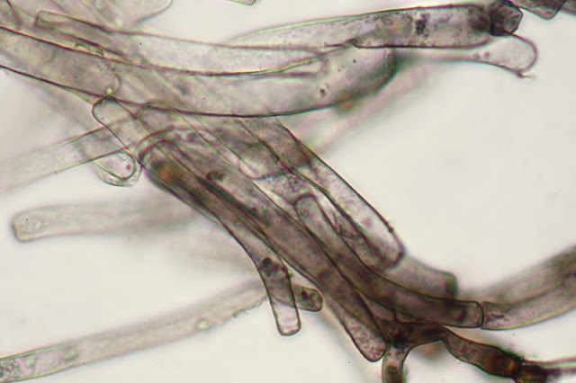 Un detalle de las hifas más externa nos muestran unas paredes impregnadas de pigmento y muy deterioradas y tabiques de separación entre células más estrechos y provistos de fíbulas.