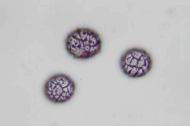 En algunas esporas las verrugas sueltas son más evidentes que en otras y el enfoque que hagamos pone más o menos en evidencia la placa hilar y el apículo.
