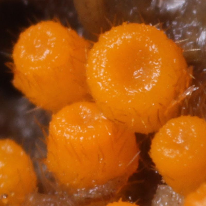 nacen los pelos del excípulo, como pestañas, de base ensanchada, pero no