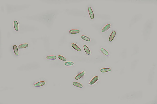 En toda la superficie himenial se producen grandes cantidades de esporas marrón verdosas en masa pero amarillentas muy claras al microscopio, alargadas y naviculares, de paredes lisas, en agua de, 7.8 [9.3 ; 9.9] 11.4 × 3.2 [3.6 ; 3.8] 4.2 micras. Mucho más pequeñas que las que aparecen en la bibliografía y las de otras especies afines, posiblemente por la inmadurez del ejemplar estudiado (pendiente de revisión y de estudio de otras recolecciones)