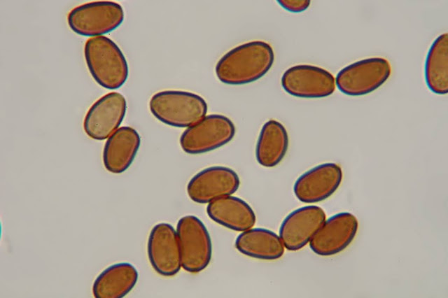 Esporas elipsoidales de paredes lisas, marrones, sin apenas apículo y con un poro germinativo pequeño y poco visible. En nuestras muestras en agua de 7.4 [8 ; 8.2] 8.8 x 4.6 [4.9 ; 5] 5.3 y 6 [6.8 ; 7.1] 7.9 × 3.7 [4.2 ; 4.4] 4.8 micras, más pequeñas que las que aparecen citadas en la bibliografía.