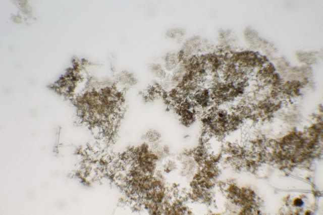 Observadas en potasa se aprecian finas hifas muy irregulares.